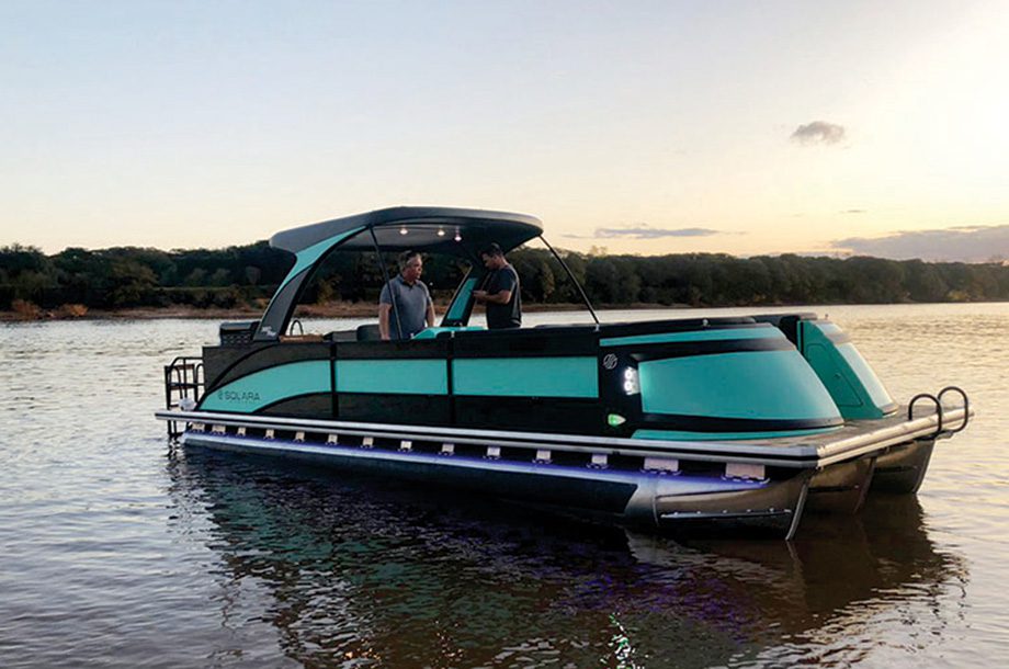 O barco ainda vem com um amplo teto rígido com iluminação em LED que pode receber placa solar para o carregamento das baterias. Além disso, o pontoon tem um banheiro que fica “escondido” embaixo do solário de proa, projetado para proporcionar mais privacidade a quem está a bordo.