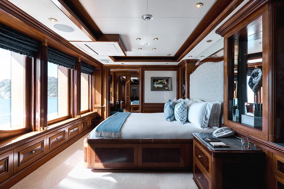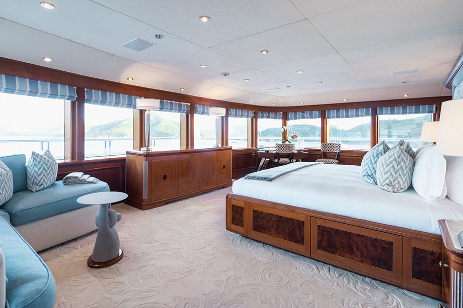 Ao todo, são sete cabines, que acomodam até 12 hóspedes (a tripulação total é de 21 pessoas). Nesse total estão duas suítes master: uma no convés principal, na proa, com 130 m² e banheira de hidromassagem; e outra no convés superior, também à proa, com vista privilegiada para o horizonte.