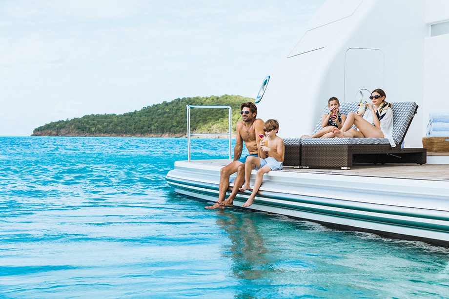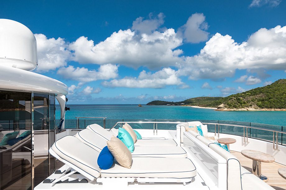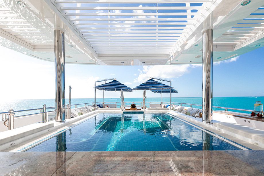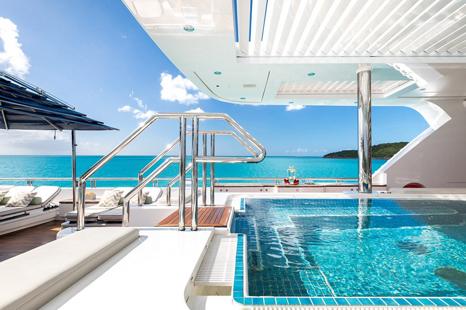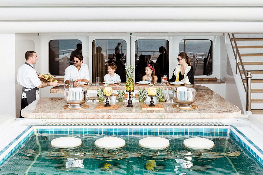 Na popa, o beach club traz sauna, bar e área de estar relaxante. À noite, o mesmo espaço se transforma em uma espécie de boate, com luzes e sistema de som de última geração. A diversão também está mais do que garantida com os brinquedos aquáticos disponíveis a bordo, que transformam o barco em um verdadeiro parque aquático.