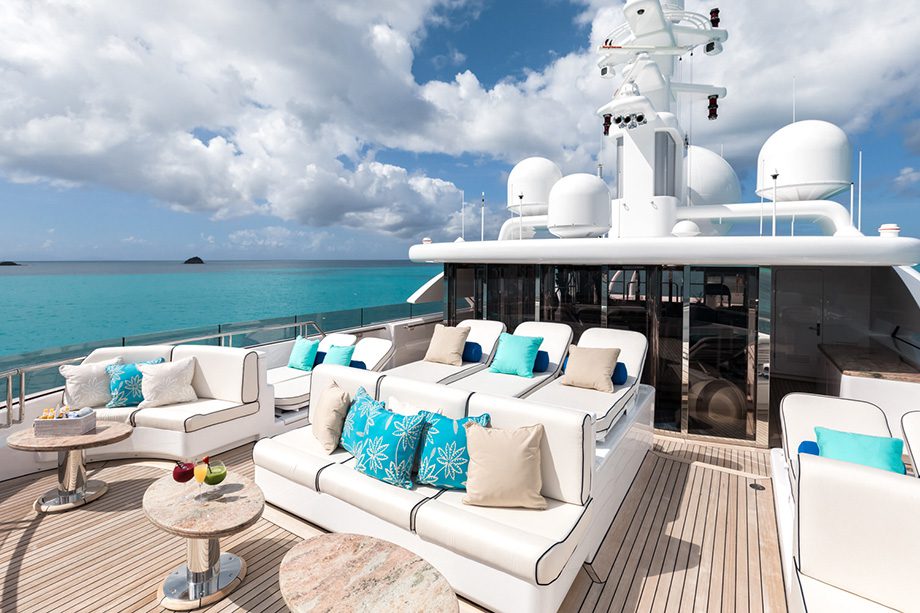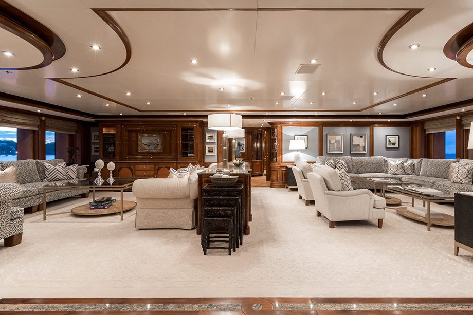 Depois de aproveitar um dia de diversão nas áreas externas do megaiate, os hóspedes podem relaxar no interior do barco, que não deixa a desejar. São inúmeras as áreas de estar, todas com estofados confortáveis dispostos em ambientes com detalhes pensados milimetricamente.