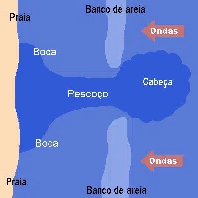 A corrente de retorno é uma das principais causas de afogamento nas praias. Trata-se de um fluxo estreito e rápido de água que se forma quando a água empurrada pelas ondas de volta à praia encontra um “corredor” para retornar ao mar. Esse movimento forma um canal de repuxo em direção ao alto-mar e cava uma espécie de valeta na areia, deixando aquele trecho mais fundo e muito mais difícil de sair.