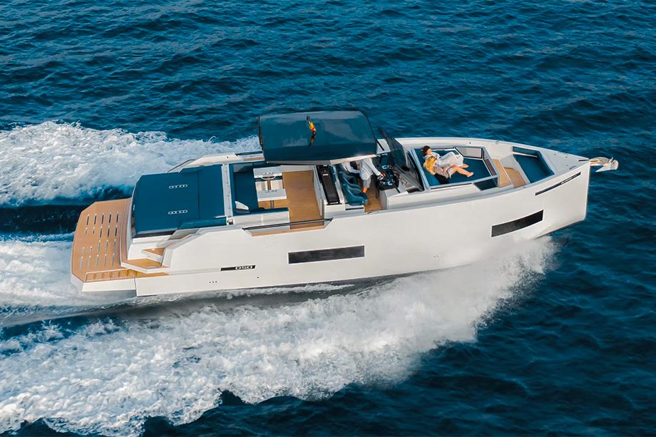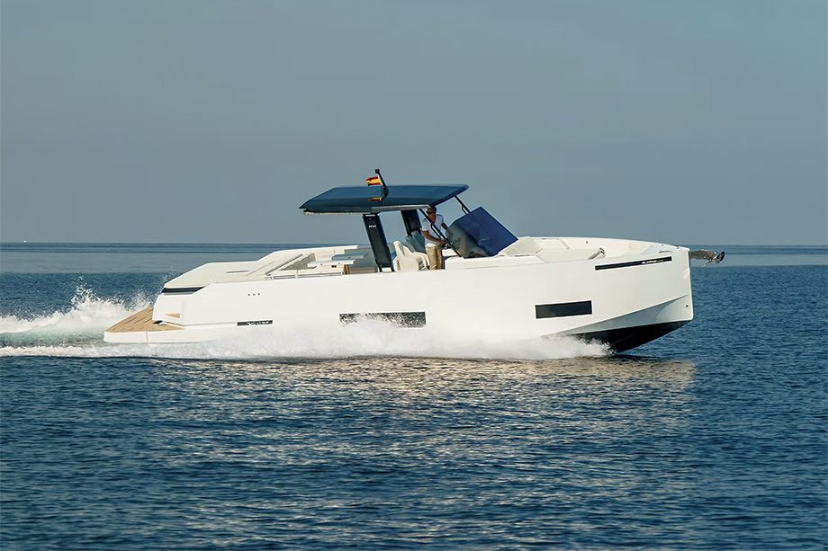 O casco em “V” aliado aos dois motores de popa — tipicamente ocultos pela marca — permite atingir velocidade máxima de 50 nós (cerca de 92 km/h), a depender da carga a bordo. O convés, por sua vez, oferece circulação contínua entre solários, cozinha e posto de comando. Além disso, o modelo vem equipado com teto soft-top, que pode ser substituído pelo hard-top como opcional.