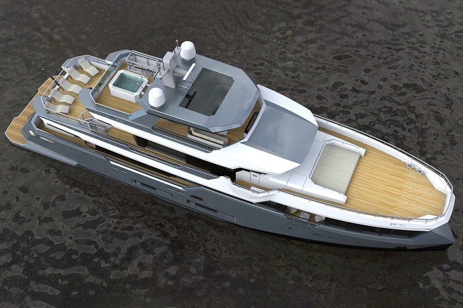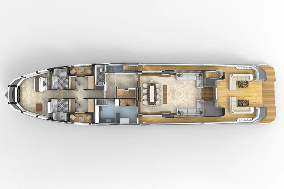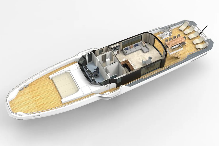 Nessa área, Şenol optou por um desenho com estrutura larga e escalonada, que permitiu mais espaços internos e externos a bordo. Com perfil diferente do usual, que tem linhas diagonais, o modelo é mais vertical e horizontal. Dessa forma, foi possível ter mais espaço interno no convés principal e um espaço amplo a céu aberto no convés superior.