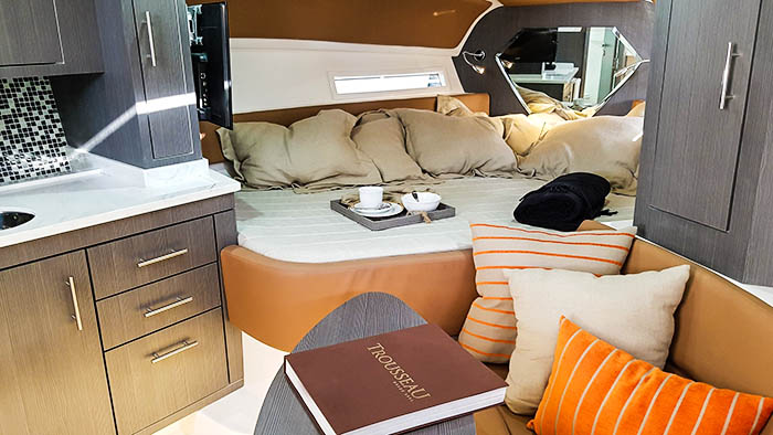 O cockpit — que privilegia o conforto, mas sem abrir mão da beleza — oferece dois sofás e banco duplo de pilotagem, que tem encostos individuais e suporte para os pés, o que é bom, pois aumenta a altura do piloto e do acompanhante quando sentados. Além de bonito, o painel em arco tem espaço de sobra para os instrumentos do motor, uma bússola, disjuntores e até um eletrônico com tela de 12 polegadas.