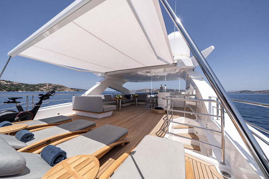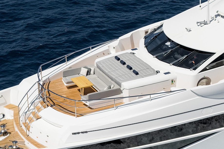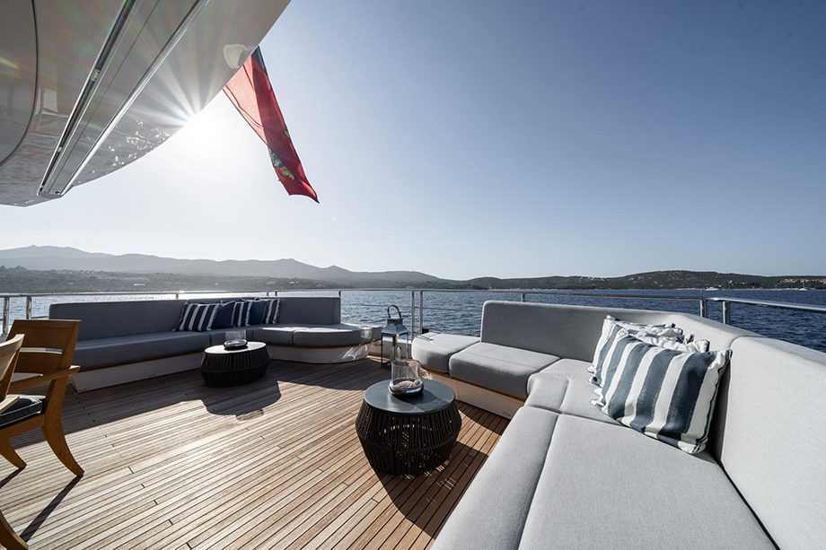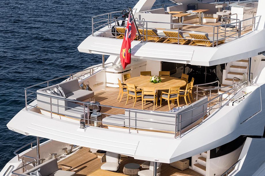 Mais abaixo, o deque superior na popa se beneficia de uma grande mesa de jantar feita em madeira do tipo teca, que comporta até 10 pessoas confortavelmente. Há ainda inúmeros espaços feitos para servir de áreas de estar, por isso não faltam espreguiçadeiras, poltronas, mesas ou luz solar.