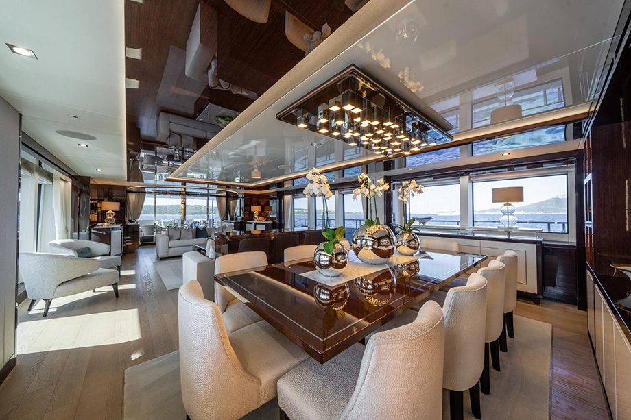 Assim, passeando pelos seus 40,05 metros de comprimento (131,3 pés), os olhos mais apurados logo encontram detalhes em Wengué (rara madeira nobre africana) e mármores premium, como Mystery White (elegante pedra natural) e Carrara Gioia (mármore italiano). Combinados, os materiais dão ao interior do barco a classe que um superiate de 13,9 milhões de euros merece.