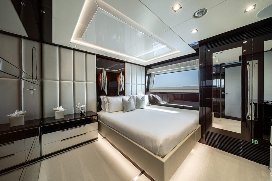 Até 12 hóspedes podem aproveitar os recursos do superiate em cinco luxuosas cabines, entre elas, uma suíte máster com largura total da boca no convés principal (cerca de 8,9 metros). O espaço está equipado com TV 55 polegadas, closet, frigobar, penteadeira e banheiro revestido com o mármore italiano Statuario.