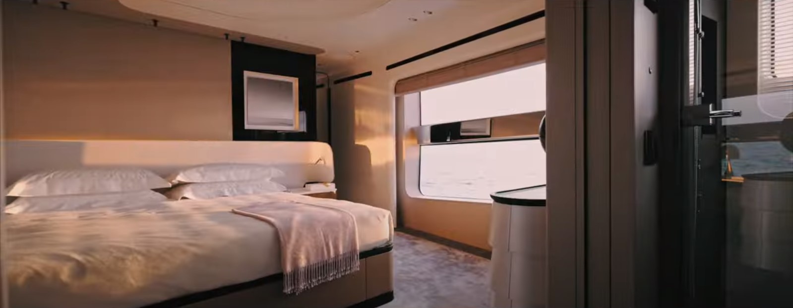 Os interiores também trazem surpresas do ponto de vista do layout, com um pátio privativo no deck principal equipado como uma área de estar protegida que dá acesso a um lounge interno. Aqui, a tradicional área de jantar formal foi abolida, transformando este deck em uma área de confraternização e encontros informais, uma configuração espacial arrojada.