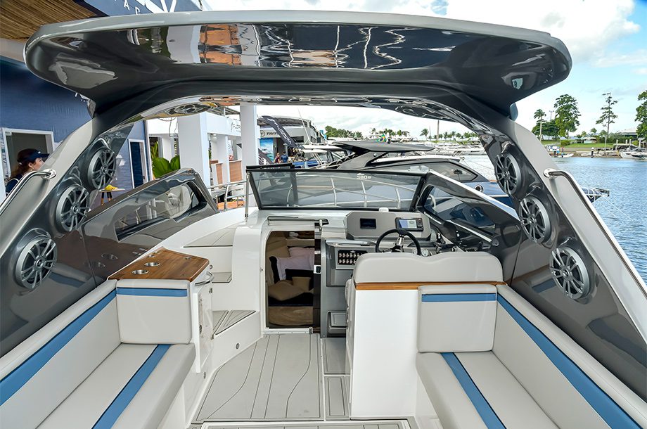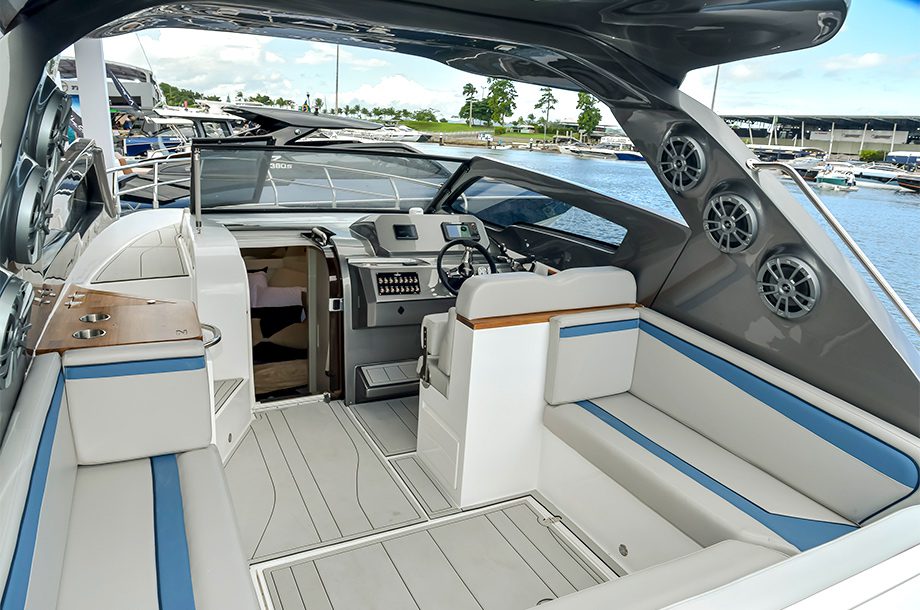 Nas águas da Baía de Guanabara, a Azov optou por apresentar a versão cabinada do modelo. Entretanto, a marca também oferece a opção aberta — fica tudo a gosto do cliente. Além da Z290C, estão atracadas no evento a Z260 (lancha escolhida pelo cantor Wesley Safadão) e a Z380 (maior do estaleiro em exposição).