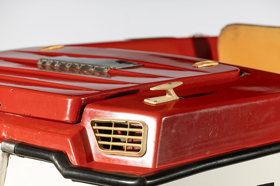 Em bom estado original, com destaque para o para-brisa panorâmico, a lancha se destaca visualmente. Os tons de vermelho e branco dão aquele toque de esportividade ao barco, que carrega ainda um motor de popa Dauphine Gordini de 40 cv, que permitia atingir 50 km/h — atualmente, o equipamento precisa de manutenção.