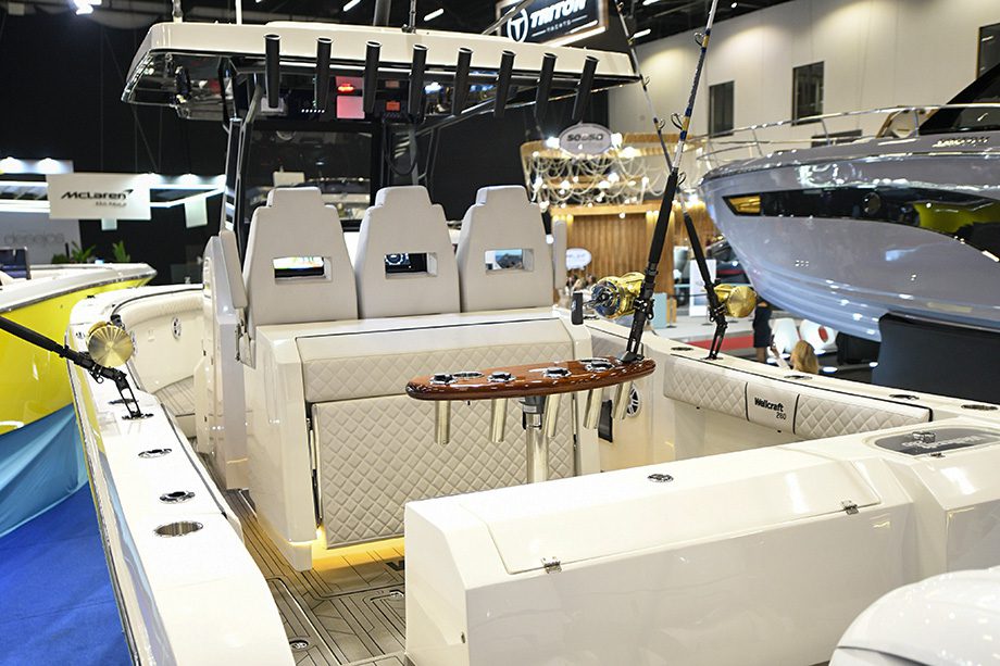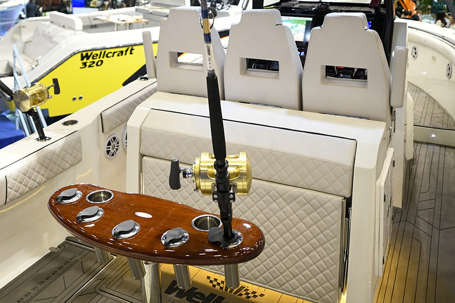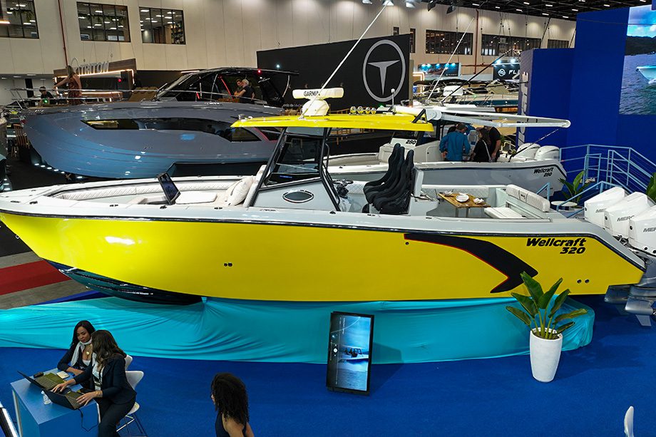 Para fechar o estande da Wellcraft no maior salão náutico da América Latina, o estaleiro exibiu duas Wellcraft 320, equipadas com diferentes conjuntos de motorização: uma com parelha de 300 hp e outra com trinca de 300 hp. A estratégia permite mostrar ao visitante, na prática, as diferenças de performance e estética entre as duas opções de propulsão.