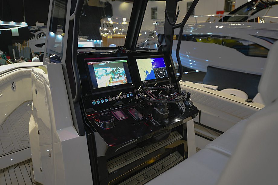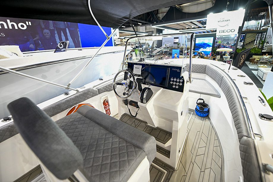 O maior modelo levado ao evento, de 32 pés, combina espaço e tecnologia. Assim como os outros, tem casco construído por infusão a vácuo, que garante leveza, resistência e durabilidade. Já o design prioriza estabilidade e facilidade de acesso às áreas estratégicas para a pesca.