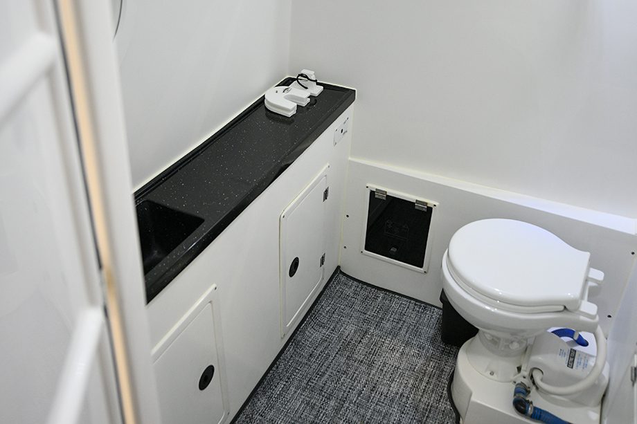 O banheiro, espaçoso para a categoria, tem pé-direito confortável e vem equipado com pia larga, vaso elétrico e torneira com água doce. No quesito acessórios de série, inclusive, o barco também impressiona: são mais de 50 itens ao todo.