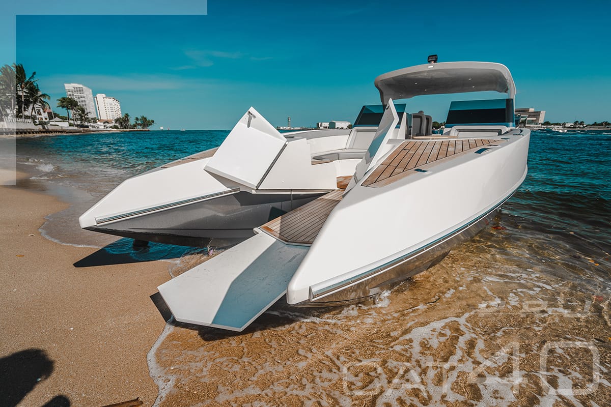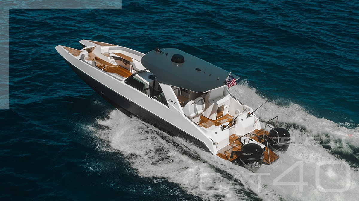 Equipada com dois motores de 400 hp cada, a primeira unidade da Cat 40 está na água, em fase de testes, já com 400 horas navegadas. E já disse a que veio, alcançando 52 mph (45 nós) de velocidade máxima. E essa nem é a melhor parte da história.