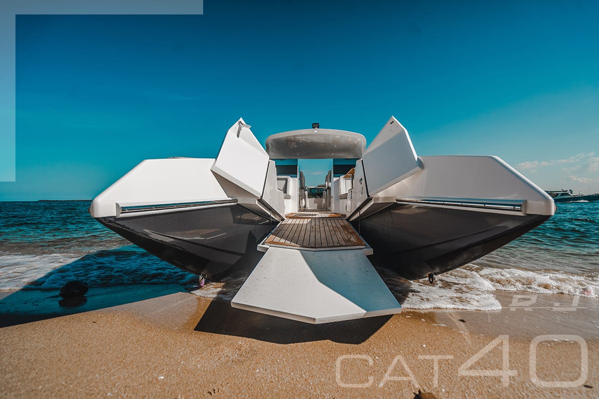 “Desde o primeiro instante, decidimos que seria necessário fazer alguma coisa diferente, para não errar na fórmula”, revela Pedrão. O pulo do gato, junto com os cascos navegadores de um catamarã, foi introduzir uma abertura na proa, por onde é rebaixada, por acionamento elétrico, uma rampa com 85 cm de largura — sim, tanto o Cat 40 como o Cat 60 têm uma rampa de proa para embarque e desembarque, tanto em uma praia como em um píer flutuantes.
