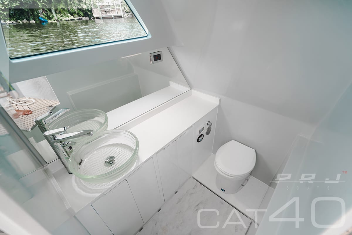 Outra decisão de primeira hora foi que os barcos deveriam ser leves, para navegar com apenas dois motores; daí os cascos terem sido construídos pelo sistema de infusão, com o uso de fibra de carbono no hard top. Além disso, deveriam ter uma pequena cabine com cama de solteiro, com banheiro, e oferecer bastante espaço de porão, com uma grande área na popa para armazenar os equipamentos de mergulho, incluindo cilindros e até um compressor para recarregar as garrafas. Para se ter uma ideia do que representam esses espaços, o modelo maior (o Cat 60, ainda em fase projeto), terá garagens para dois jets!