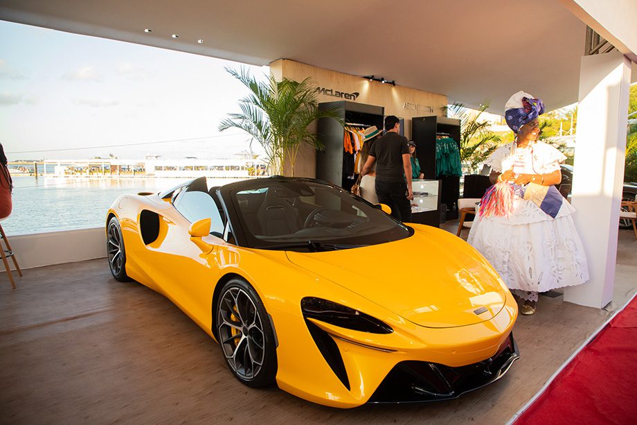 Carros esportivos de luxo estão expostos no Salvador Boat Show com a UK Motors