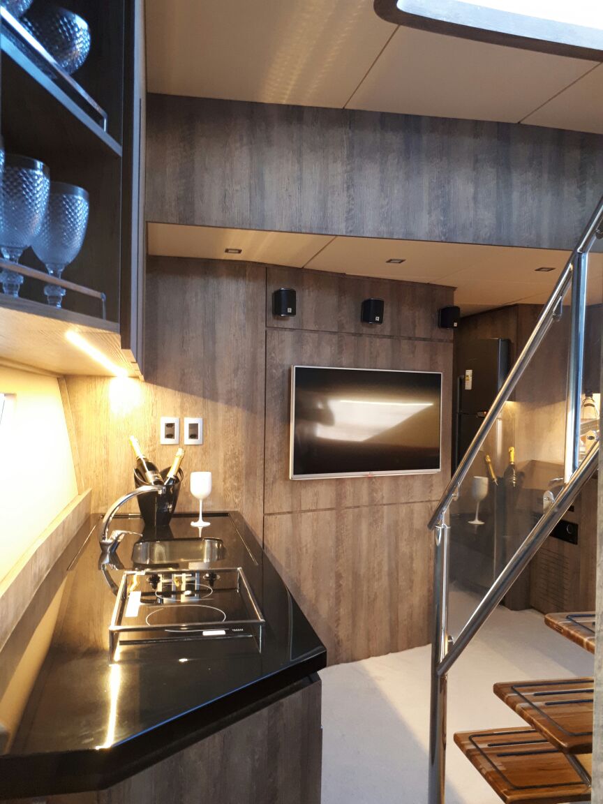 Projetado na Itália e com design inspirado na Cimitarra 780, o modelo tem 18, 65 metros de comprimento e 180 m² de área útil, com capacidade para 20 pessoas de dia e 11 em pernoite, acomodadas nos três camarotes – duas suítes – da cabine.
