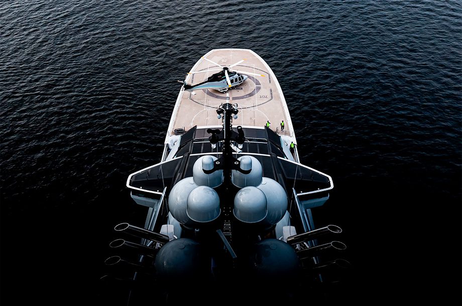 O estúdio de design responsável pelo projeto optou por uma proa nunca vista num megaiate, inspirada em porta-aviões. São dois helipontos, sendo que um deles possui um hangar retrátil que pode ser usado para proteger o veículo aéreo.