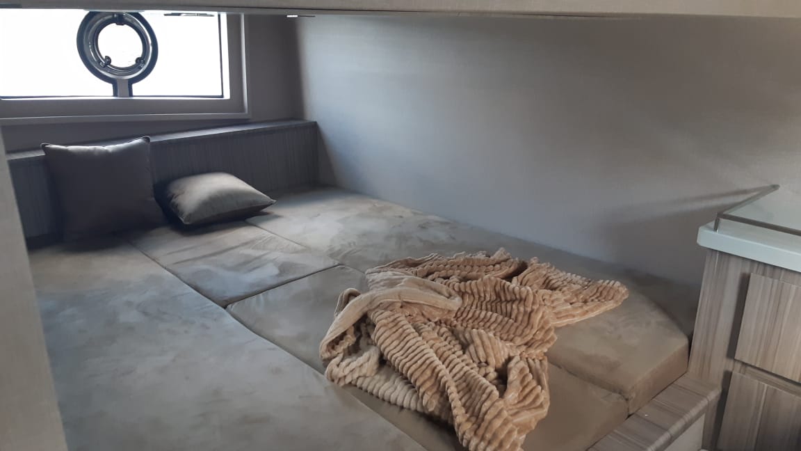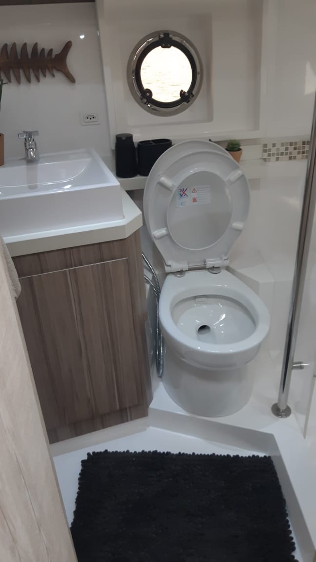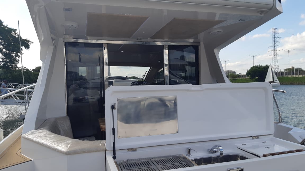 No cockpit, a passagem para a proa (que tem um grande e confortável solário, com encosto reclinável) é espaçosa e segura, por conta da boca de 3,60 m do barco. Na popa, há um sofá em L na popa, além da área gourmet, com uma cuba em versão prime, geleira embutida e churrasqueira (que pode ser a carvão ou elétrica).