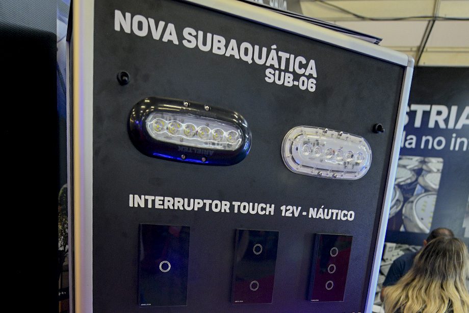 Especialista em soluções eletrônicas para embarcações, a Arieltek destacou no evento a nova luminária subaquática para uso externo, Sub-06, e o interruptor de cabine 12V com acionamento touch — este para uso interno.