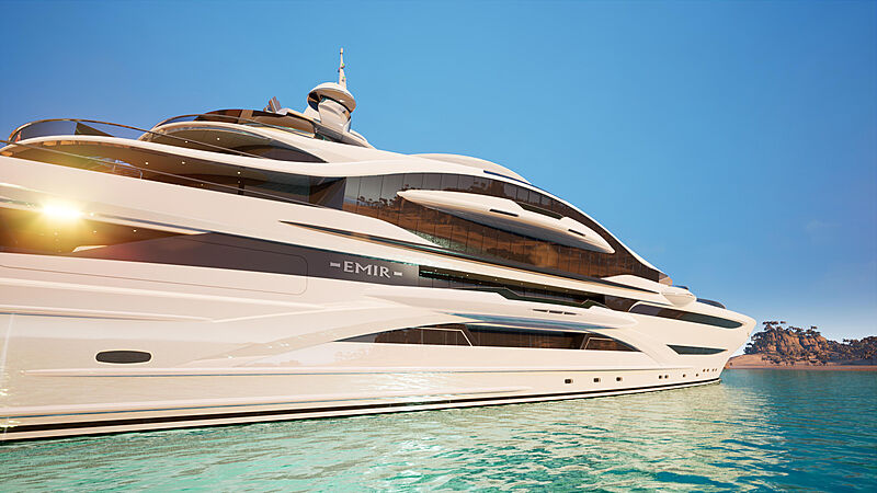 O estúdio de design Gresham Yacht Design, sediado em Londres, revelou seu último conceito: o Emir, de 120 metros de comprimento. O modelo conta com dois helipontos certificados, de onde os hóspedes podem seguir para os salões e decks inferiores.