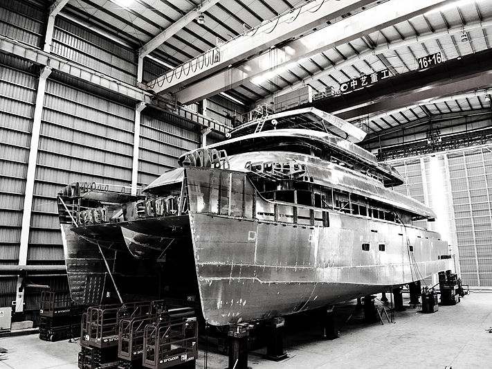 Atrás das portas do galpão da Silver Yachts está o novo iate multicasco de 35,9 metros SpaceCat, que, como visto nas últimas imagens compartilhadas pelo estaleiro australiano, está próximo de ser entregue. A equipe da instalação chinesa da Silver Yachts na província de Guangdong concluiu a soldagem do modelo de alumínio.