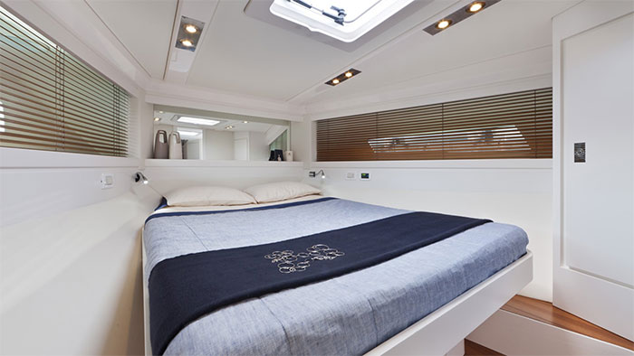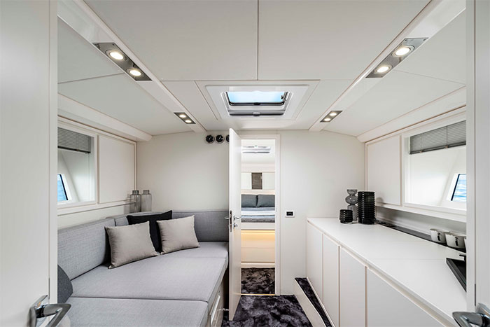 No interior, existe a opção de ter um ou dois camarotes. Caso o proprietário prefira a primeira opção, o local da segunda acomodação é recheado de assentos em um salão, proporcionando, também, um espaço maior para a cozinha. Ainda assim, essa sala de jantar no salão também se converte em uma cama extra, para eventualidades. Quanto à decoração, a paleta agora é branca e possui alguns detalhes em teca.