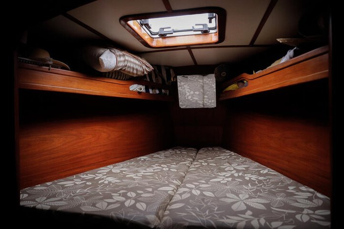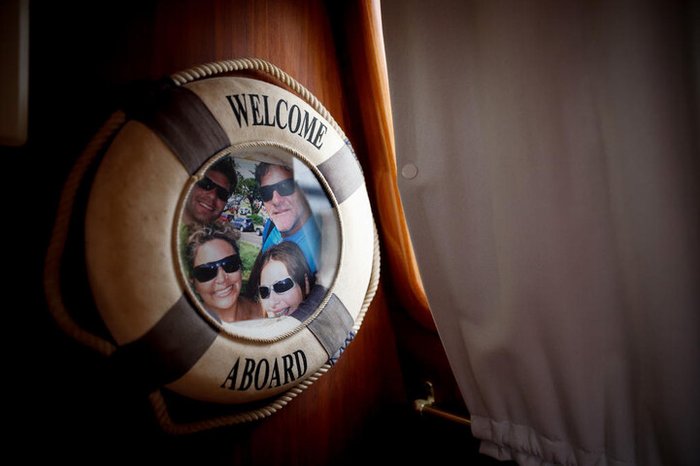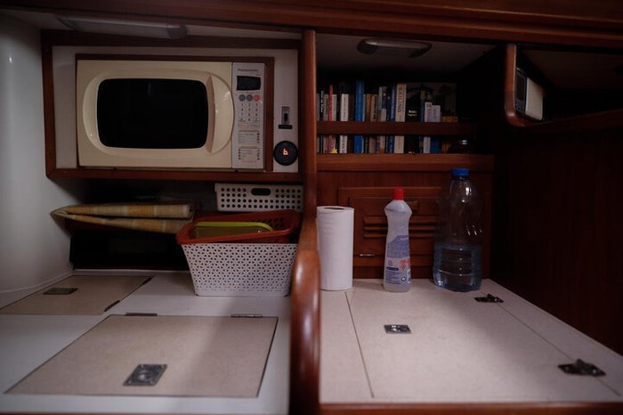 O veleiro também tem ar-condicionado, TV, uma foto da família dentro de um porta-retrato em forma de boia salva-vidas e até uma pequena biblioteca, com livros náuticos. A cozinha é equipada com fogão, forno, geladeira, congelador e microondas, e Gigante ainda leva nas viagens uma churrasqueira portátil.