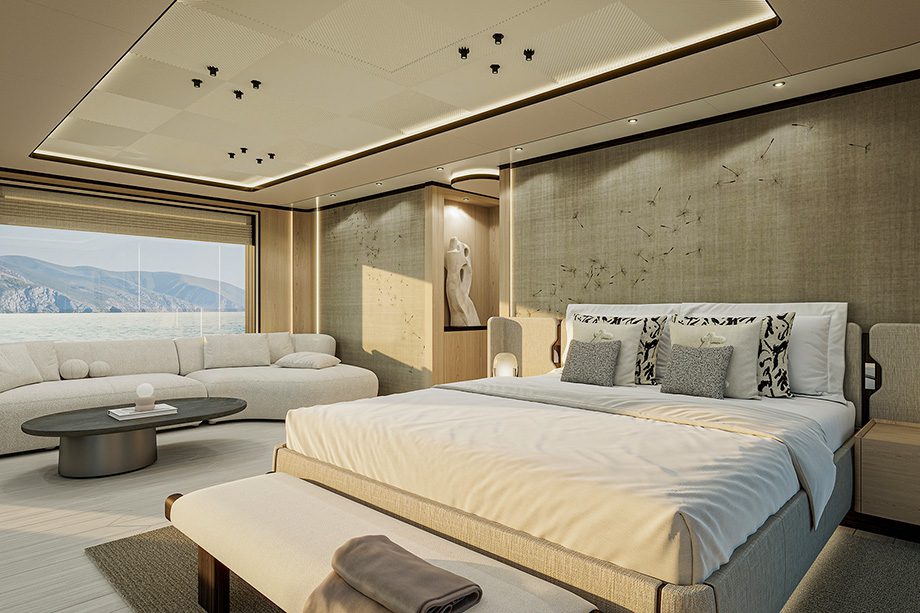 No convés principal, onde em outros superiates costuma reinar a área social, o X145 Global inova ao reservar o espaço para as cinco cabines de hóspedes. O espaço aproveita toda a boca da embarcação (9,1 metros), garantindo conforto e privacidade incomuns.