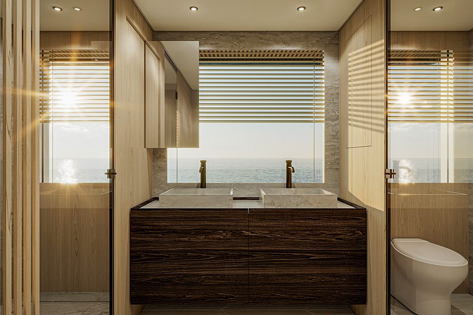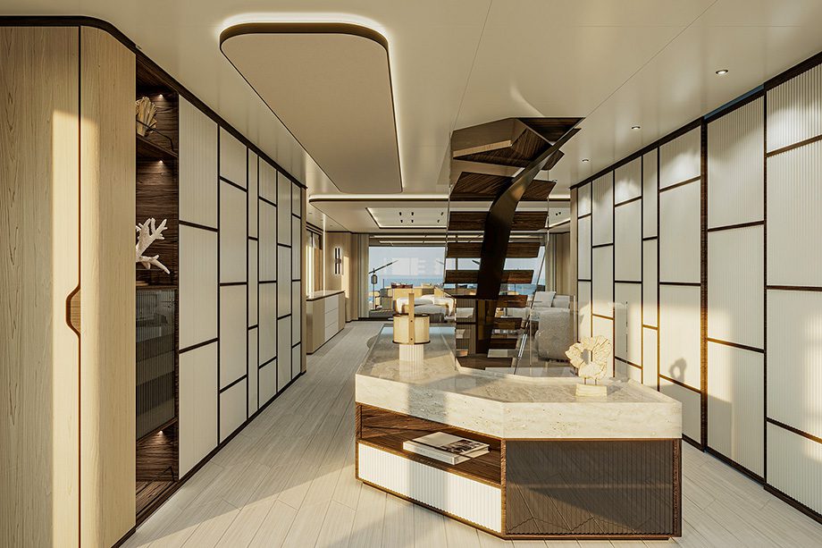O deque inferior foi desenhado com foco na tripulação de até oito pessoas. São quatro cabines duplas com banheiros privativos, além de uma cozinha profissional. A planta ainda permite incluir uma academia, que vem como cômodo opcional.
