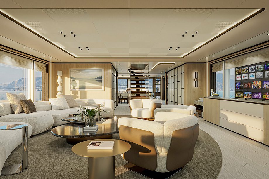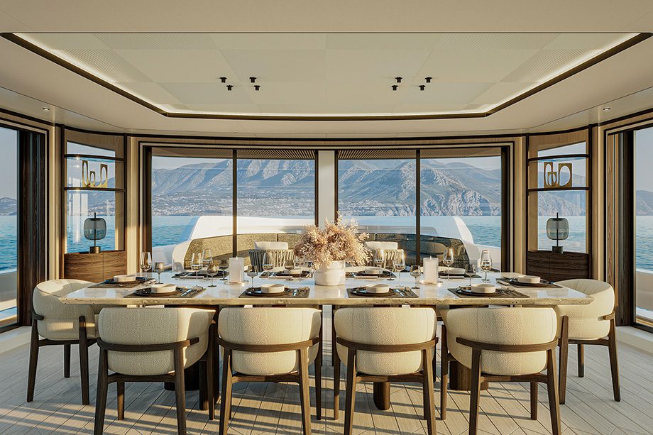 A assinatura do design externo vem do italiano Agon Studio, que combinou uma proa vertical imponente com um casco de aço de linhas limpas e amuradas baixas. Já os interiores foram desenhados pelo Hot Lab, de Milão, que apostou em paredes de vidro, layout aberto e geometrias suaves para um visual mais clean. O resultado são espaços banhados de luz natural, que convidam a contemplar o mar sem esforço.