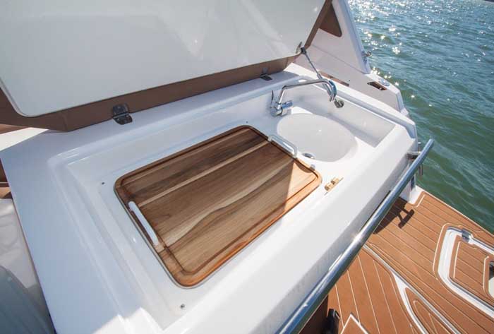Com o mesmo cockpit da versão com proa fechada, o modelo tem facilidade na entrada e espaço. Com capacidade para 14 pessoas — algo raro na categoria —, a embarcação traz um bom banheiro com ventilação natural, espaço gourmet e design que dá prosseguimento à tradição do estaleiro. Se, por um lado, o barco abre mão da cabine que a 265 Element oferece, por outro, proporciona um ganho expressivo no espaço de proa aberta, que torna os passeios durante o dia muito agradáveis.