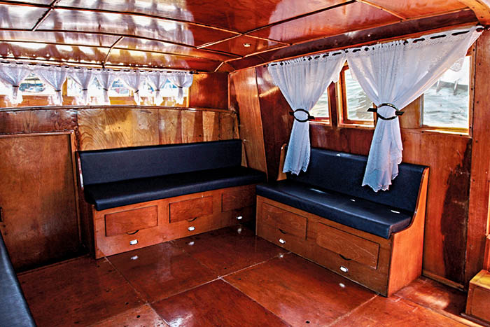 A madeira do casco, especialmente acima da linha d’água, teve de ser toda substituída e as estruturas internas refeitas a partir de relatos, já que não havia fotos antigas e a família de Juscelino fazia questão de que Gilda caísse no esquecimento, por conta das festas de seu famoso dono. Pronta, Gilda tem uma sala dotada de armários, uma sala principal com três sofás, além da cabine de comando e uma suíte, na proa. Tudo no tom forte da própria madeira, contrastado pelo azul das almofadas e dos colchões e o branco das cortinas. “Gilda emergiu tão sedutora quanto antes. A musa do lago continua arrancando suspiro por onde navega”, emociona-se Gerard, que, há dois anos, também conversou com a equipe da TV Náutica e gravou a entrevista abaixo.