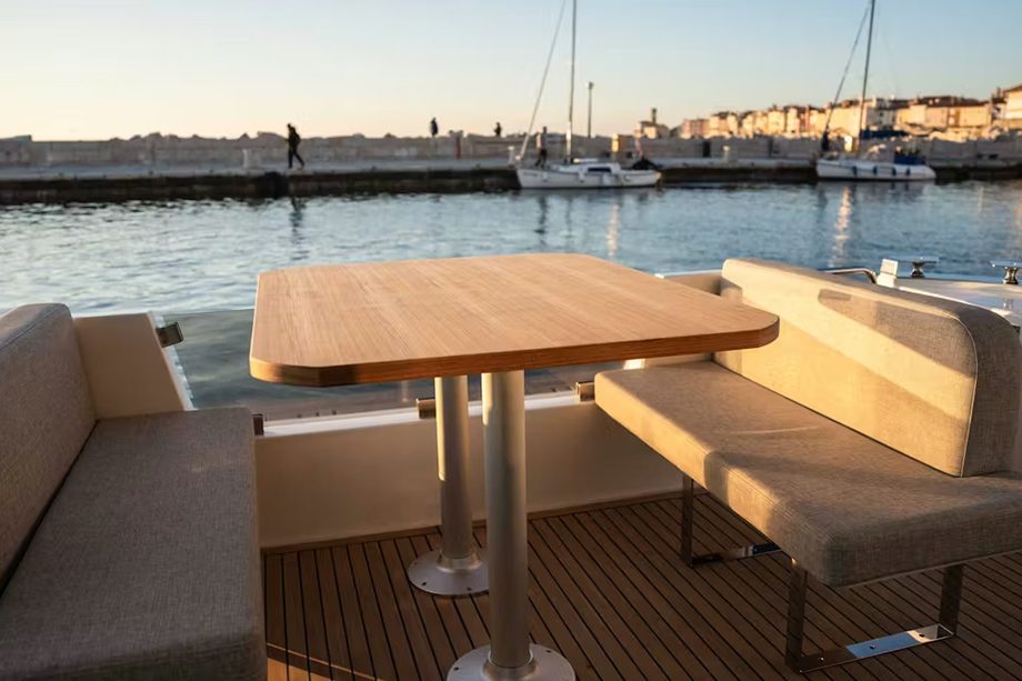 No mesmo piso, corredores externos laterais permitem acesso à proa por ambos os lados. Por lá, inclusive, fica um solário com estofados espaçosos. Já na popa, há duas opções de layout: uma tem bancos estofados e mesa, enquanto a outra opta pelo espaço amplo e aberto, para ser aproveitado como os proprietários bem entenderem.