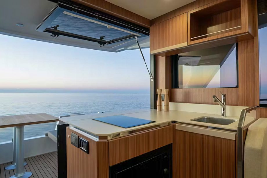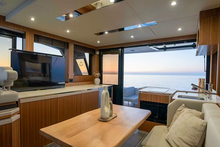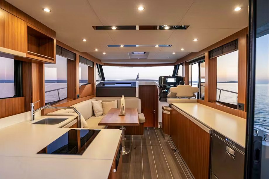 O interior dessa nova lancha foi desenhado pelo arquiteto Marco Casali, fundador da Too-Design, que projetou mais de mil embarcações reais. Pensado para o uso confortável de uma família de 4 pessoas, a cozinha do convés principal é o destaque da parte interna, que se mistura com a sala de estar e o centro de comando pelo conceito aberto.
