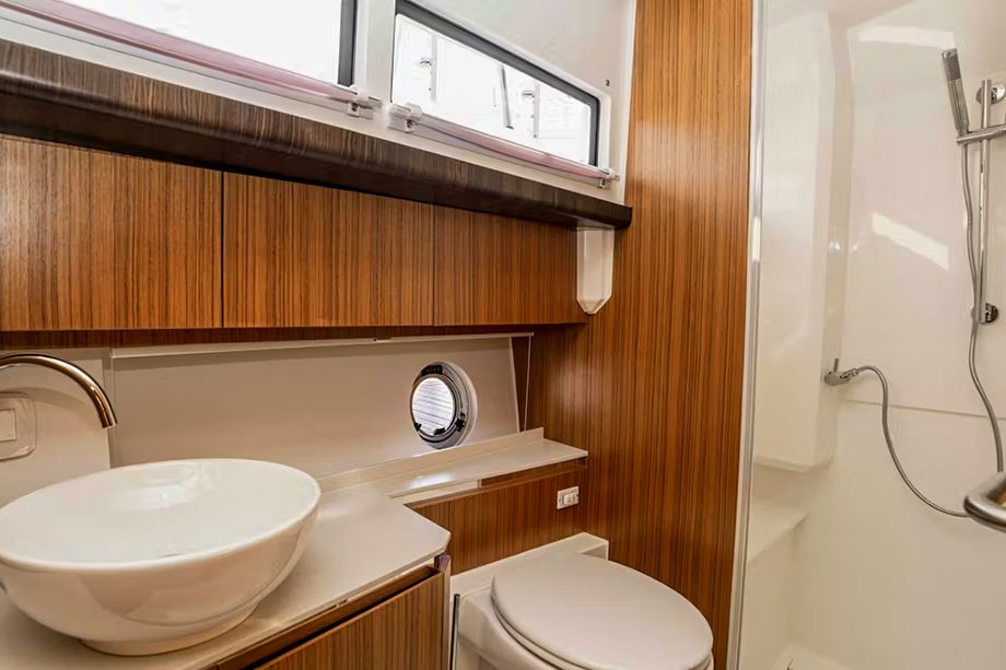 No convés inferior é onde ficam as cabines. A do casal fica localizada à proa e pode ser configurada com um espaço de home office, um sofá extra ou um banheiro privativo, que a transformaria em suíte. Mais ao centro da lancha, ficam o banheiro completo fixo e outro dormitório, com duas camas de solteiro.