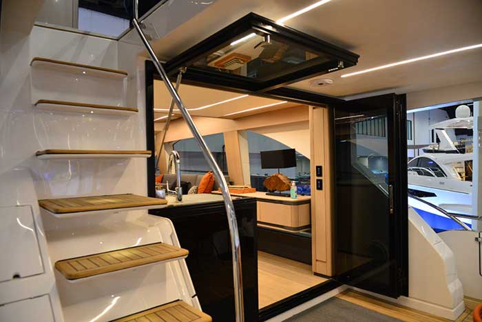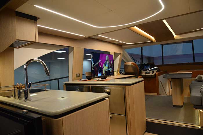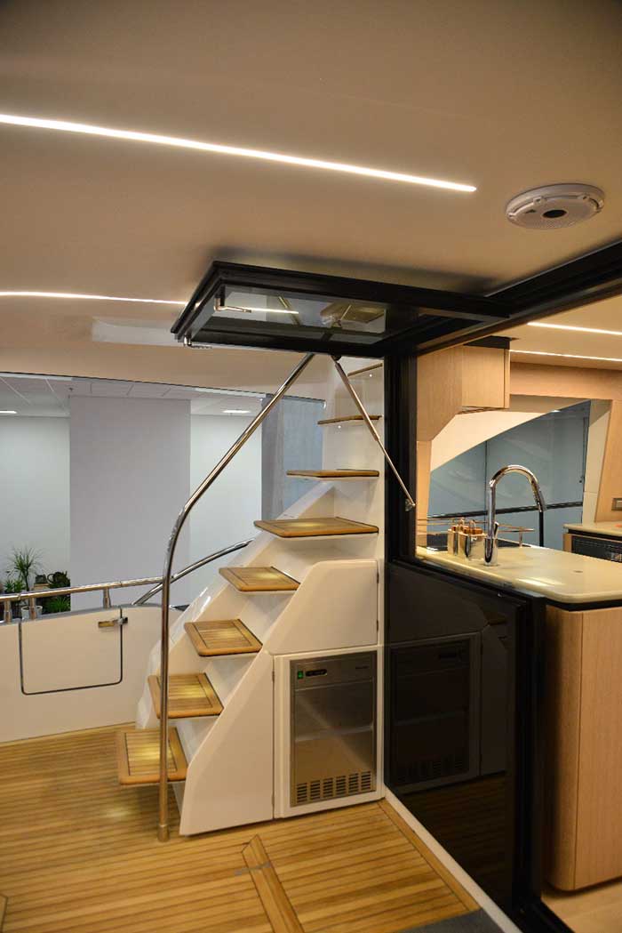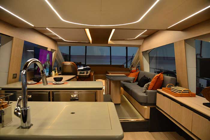 Para atender a esse requisito, o de integrar os espaços na lancha, o estaleiro apostou em um material específico: o vidro. O salão, por exemplo, ganhou janelas que preenchem quase toda a sua altura e permitem uma grande entrada de luz. A cozinha, por sua vez, é completamente aberta e não cobre a visão lateral. A porta principal é estilo camarão, unindo popa e cozinha.