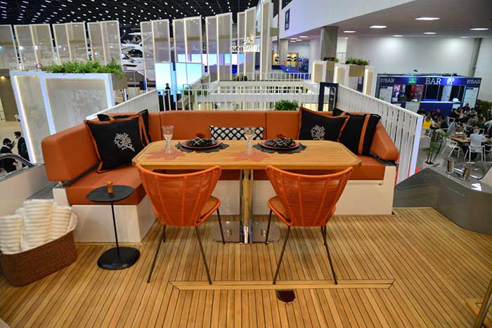 Ainda pensando em uma sensação de leveza por toda a embarcação, foram adicionados móveis flutuantes, ou modulares. No flybridge, por exemplo, além de poder configurar os bancos da forma que o proprietário preferir — em L, em U, ou em uma fileira única — eles também são removíveis, caso a vontade seja simplesmente usufruir de um ambiente livre.