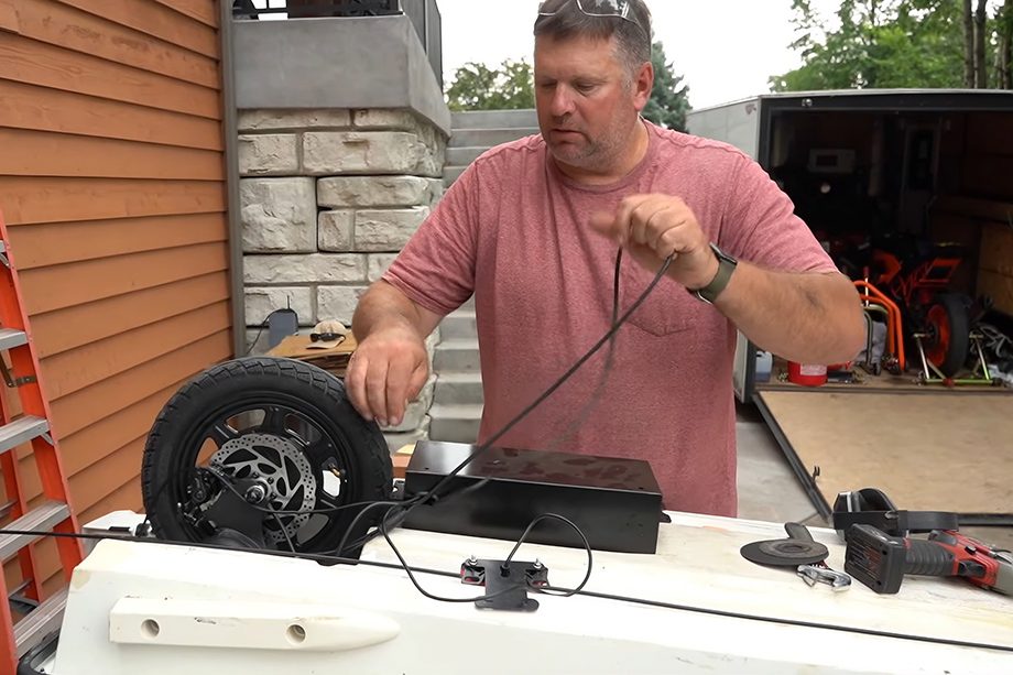 O projeto começou com o casco da moto aquática já vazio e um patinete elétrico da marca Navic, escolhido especificamente por possuir rodas de 12 polegadas — o que, segundo eles, garantiria uma condução mais suave e estável. Para suportar o tamanho do jet, a scooter original foi cortada e alongada, aumentando a distância entre os eixos. Enquanto isso, na moto aquática, foram feitos cortes precisos no casco para acomodar as rodas.