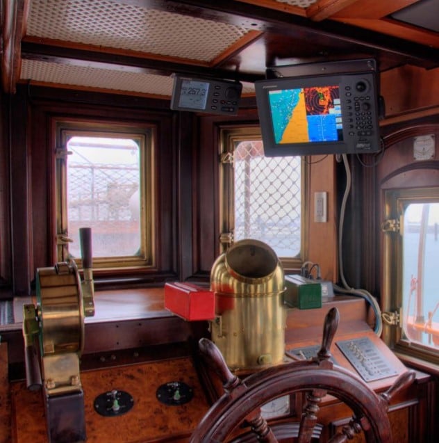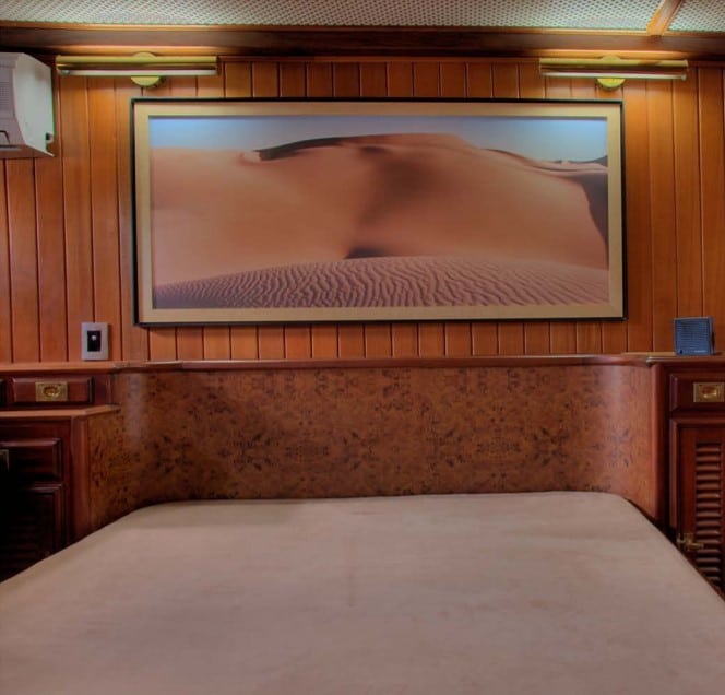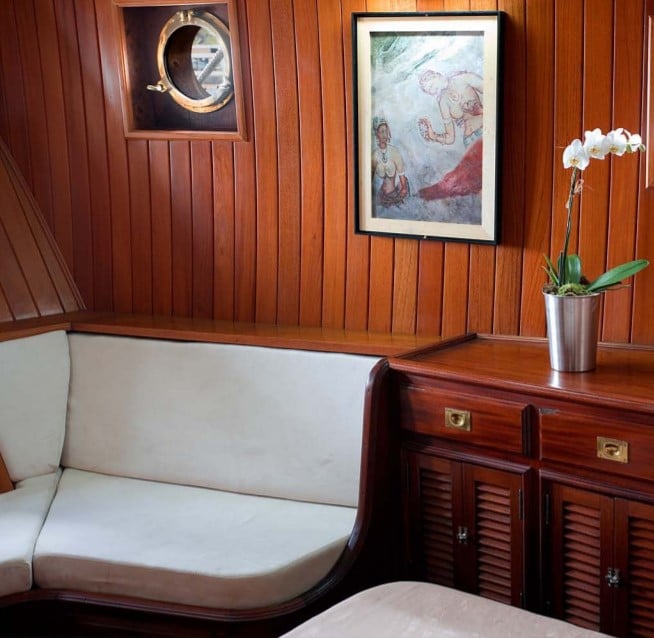 Tudo dentro dele é motivo de admiração, tanto em tecnologia quanto em conforto: a madeira brilhando nas anteparas e nos móveis, o desenho imponente, a decoração impecável e as obras de arte espalhadas pelos cômodos. São sete suítes (mais uma para os marinheiros, com quatro camas e roupeiro) e uma cozinha com nada menos que seis portas de freezer e duas geladeiras, além de algumas mordomias, como banheiras de hidromassagem, ar-condicionado, adega e um bar que salta aos olhos, tanto pela beleza como pela elegância de seu balcão e dos móveis de madeira.