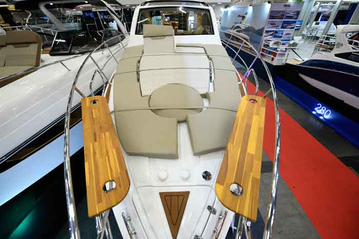 Na cabine, o camarote de proa, a cama de meia-nau, um banheiro com box e um sofá ajudam a compor o modelo. A motorização vai de 250 a 350 hp, em parelha, e custa a partir de R$ 980 mil, sem acessórios.