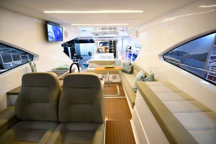 Espaçosa, a lancha conta com amplo espaço gourmet, layout de cockpit tradicional com sofá em L, chaise, cozinha e bancos individuais para piloto e co-piloto. As passagens laterais levam ao solário com encostos rebatíveis para duas pessoas na proa – o espaço conta, ainda, com apoios e porta-copos.
