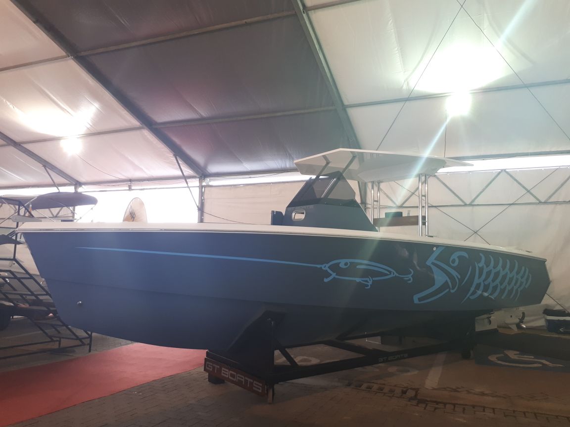 Lancha de 26 pés da GT Boats exposta em São Sebastião pode ser usada em pesca e passeio