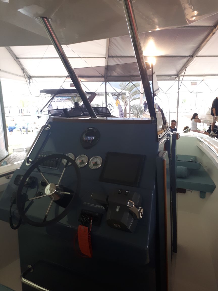 A GT Boats trouxe sua lancha de 26 pés para a primeira edição do São Sebastião Boat Show. Com um arranjo típico das lanchas de console central, com o posto de comando no meio do barco — o que proporciona espaço total para circulação ao redor dele —, a GT 26 destaca-se pela versatilidade, pois é a única na categoria que pode ter um solário ou mesa de centro na popa, transformando esta embarcação num barco de passeio. O modelo foi desenhado pelo estaleiro em parceria com o conceituado projetista Fernando de Almeida e poder ser personalizado de acordo com as necessidades do cliente. Custa a partir de R$ 230 mil (que pode ser pago em parcelas) com um motor de popa de 250 hp, pronto para navegar