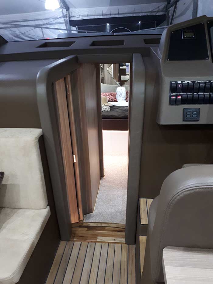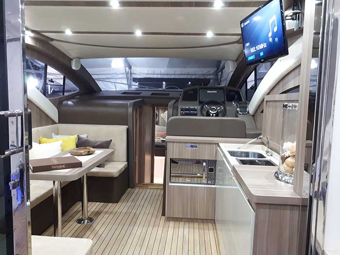 O modelo vem com praça de popa com espaço para refeições, pia com bar e espaço gourmet; no cockpit, que conta com um bom pé-direito, a sala divide espaço com a cozinha – que vem equipada com refrigerador, micro-ondas e cooktop, na pia reversível em balcão – e são separadas da praça de popa por uma porta de correr de três folhas.