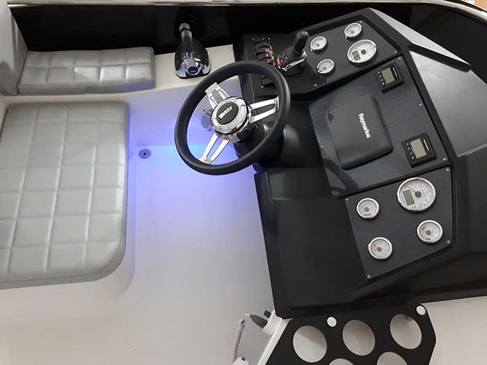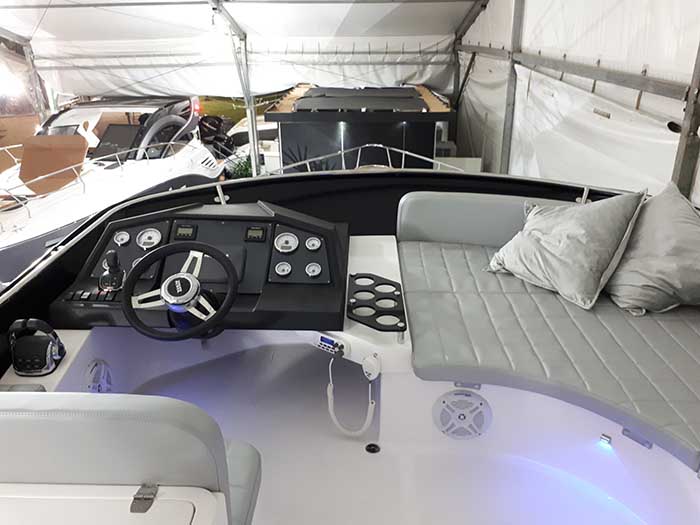 A configuração interna deste modelo inclui duas suítes, sendo uma de casal na proa e outra com duas camas de solteiro a boreste, além de camarote duplo a bombordo, todos com vasto uso de espelhos e com box fechados nos dois banheiros. A lancha de 48 pés conta, ainda, com acomodações para o marinheiro com entrada pelo espaço gourmet, na popa.