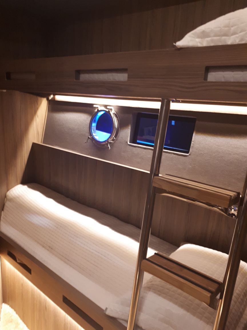 O estaleiro gaúcho Cimitarra está no São Paulo Boat Show 2017 com a lancha de 54 pés da sua nova linha. Com 16,50 metros de comprimento, o modelo conta com salão personalizável, duas suítes, camarote à meia-nau e sala multifuncional, além de acesso à cabine ampliado com o cockpit, como em todos os barcos da linha. O comando flutuante proporciona pé-direito duplo no convés inferior.