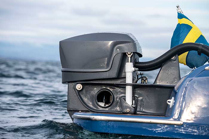 Impulsionada pelo motor de popa elétrico, de cerca de 70 hp, ela tem autonomia de 50 milhas com uma carga de baterias
