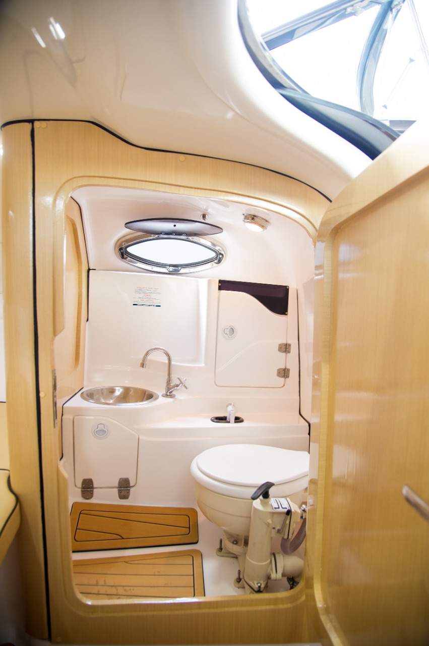 Sua cabine acomoda bem um casal e uma criança, ou até mesmo três adultos. Mas também pode ser transformada em uma sala de convivência. Por sua vez, o cockpit, com lugar para oito pessoas sentadas, contando o piloto, tem divã com encosto inclinado, caixa térmica, pia, mesa de centro removível, um minibar e dois solários para duas pessoas cada, um na popa e outro na proa. E ainda há vários paióis para guardar cadeiras de praia e colete, além de um porta-boia.